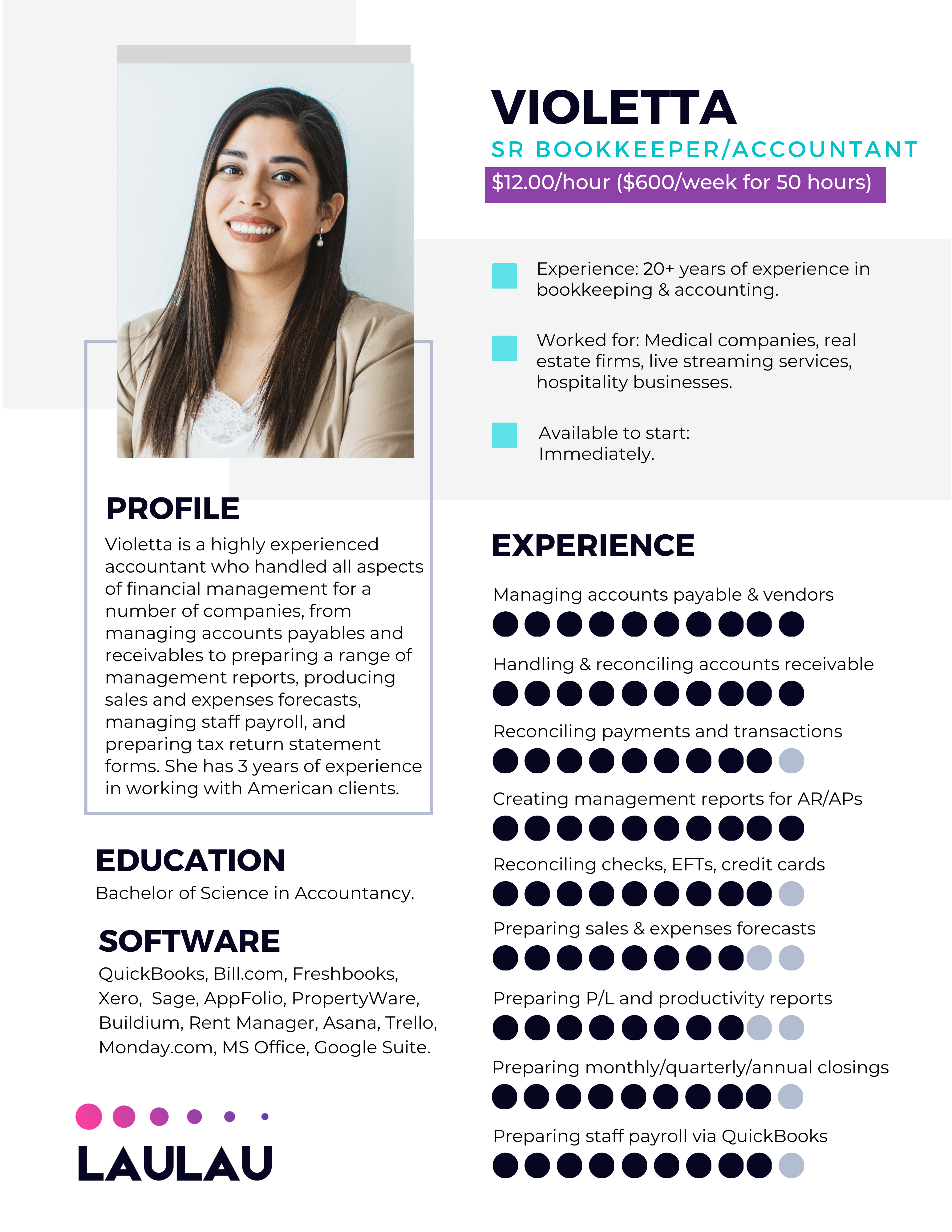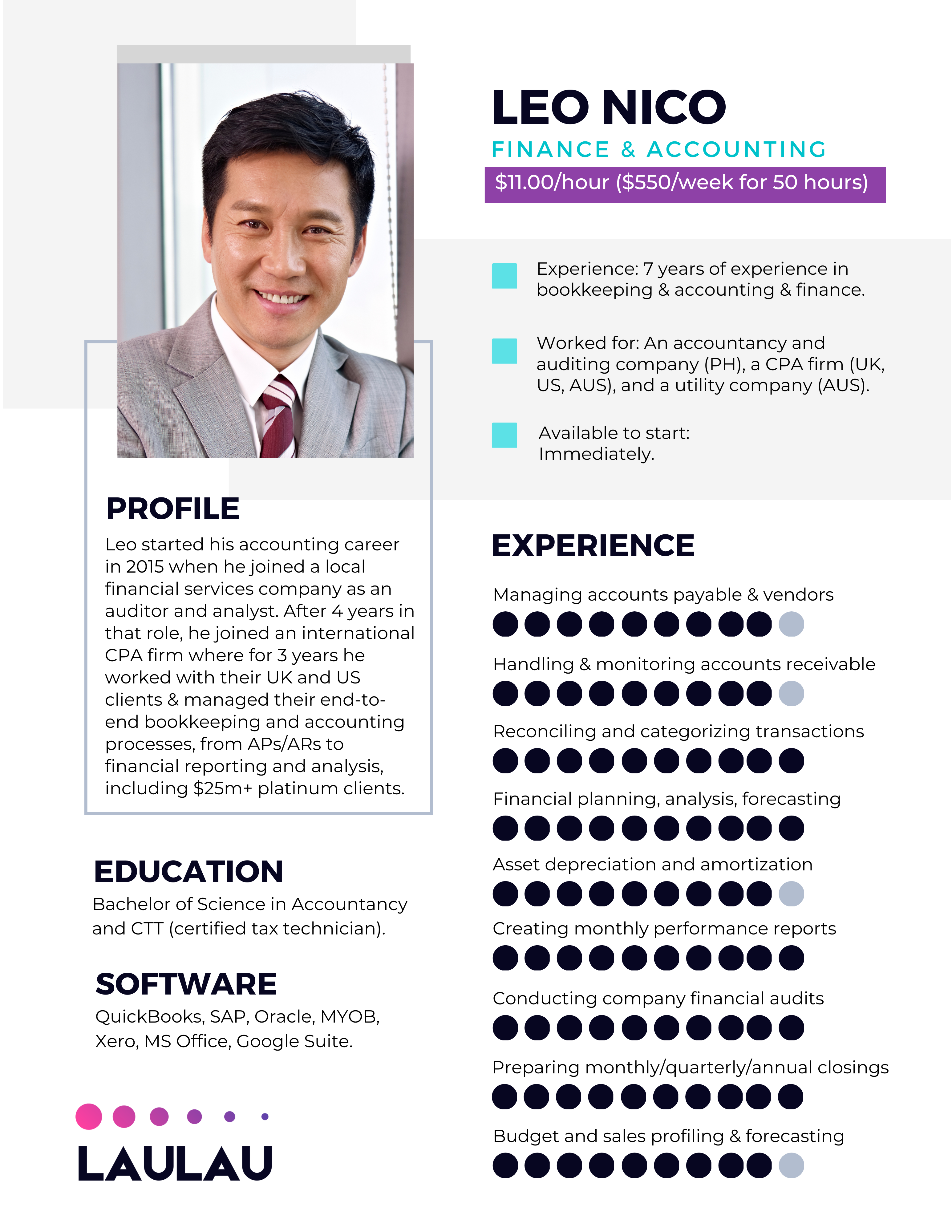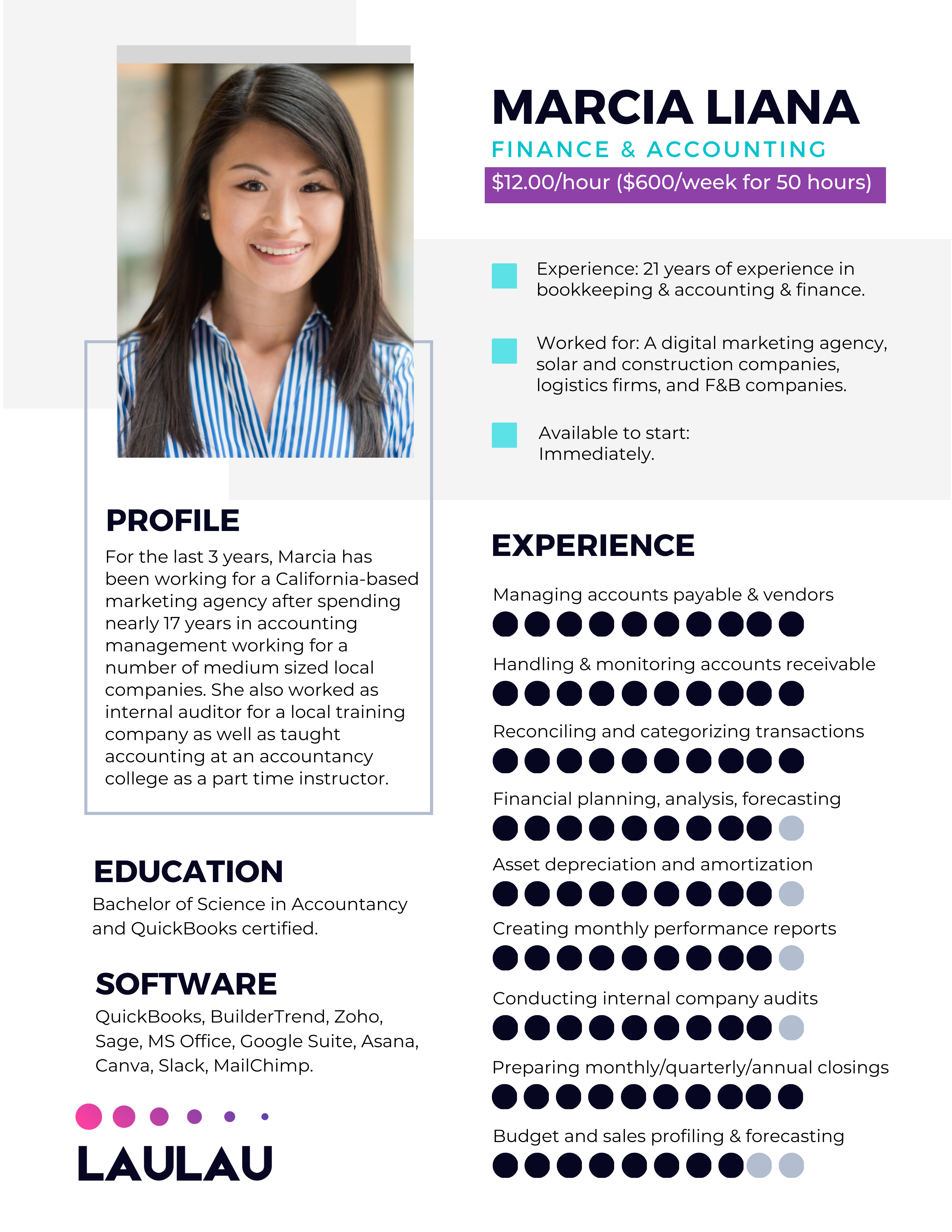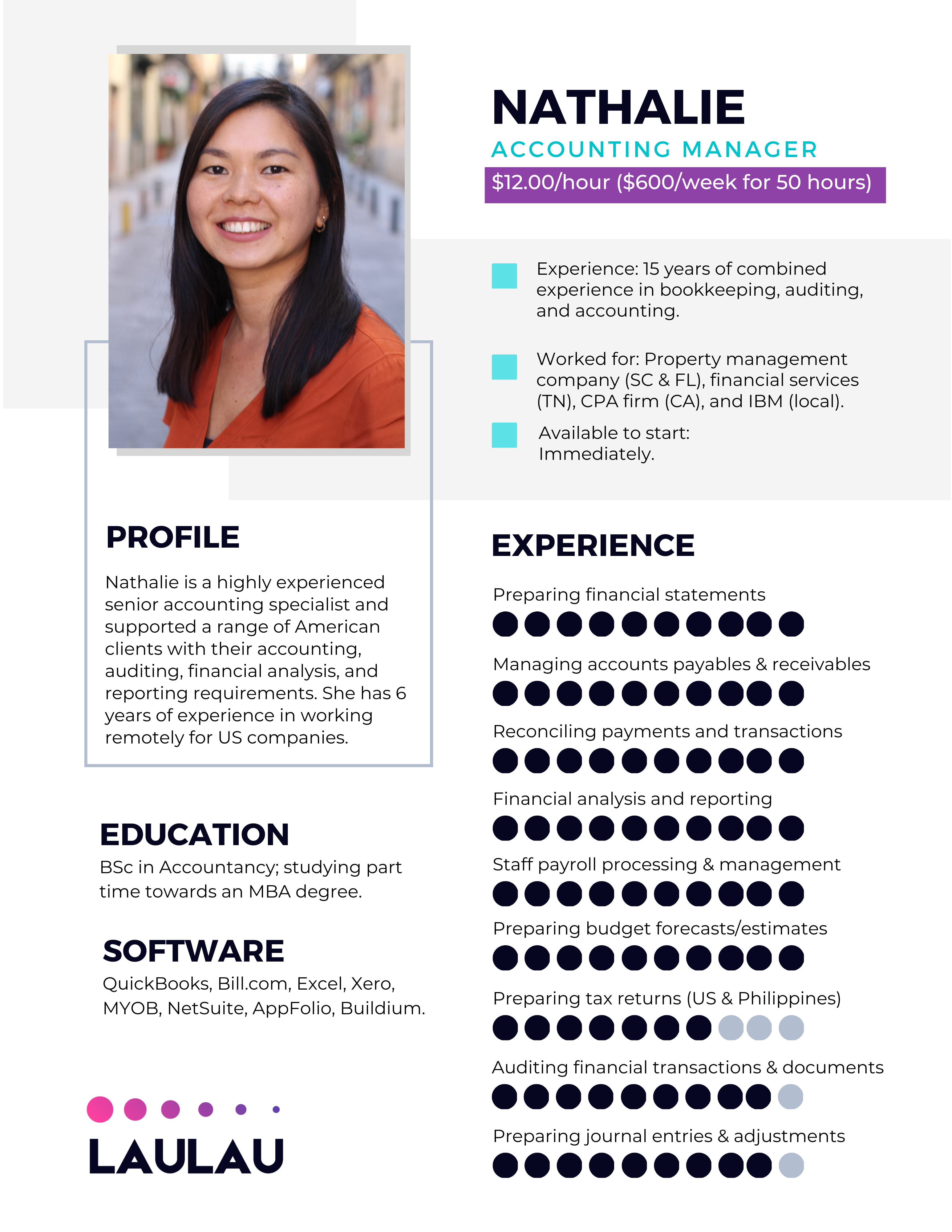“When we launched LauLau in 2011, we joined our local BNI Chapter and Chamber of Commerce and met many business owners who expressed their frustrations in finding reliable, experienced accounting staff. Not only was this a challenge, but the associated costs of hiring were a burden as well. Today, we proudly stand as the foremost provider of affordable and highly skilled remote accountants who are fully dedicated to delivering exceptional service to our valued clients.”
