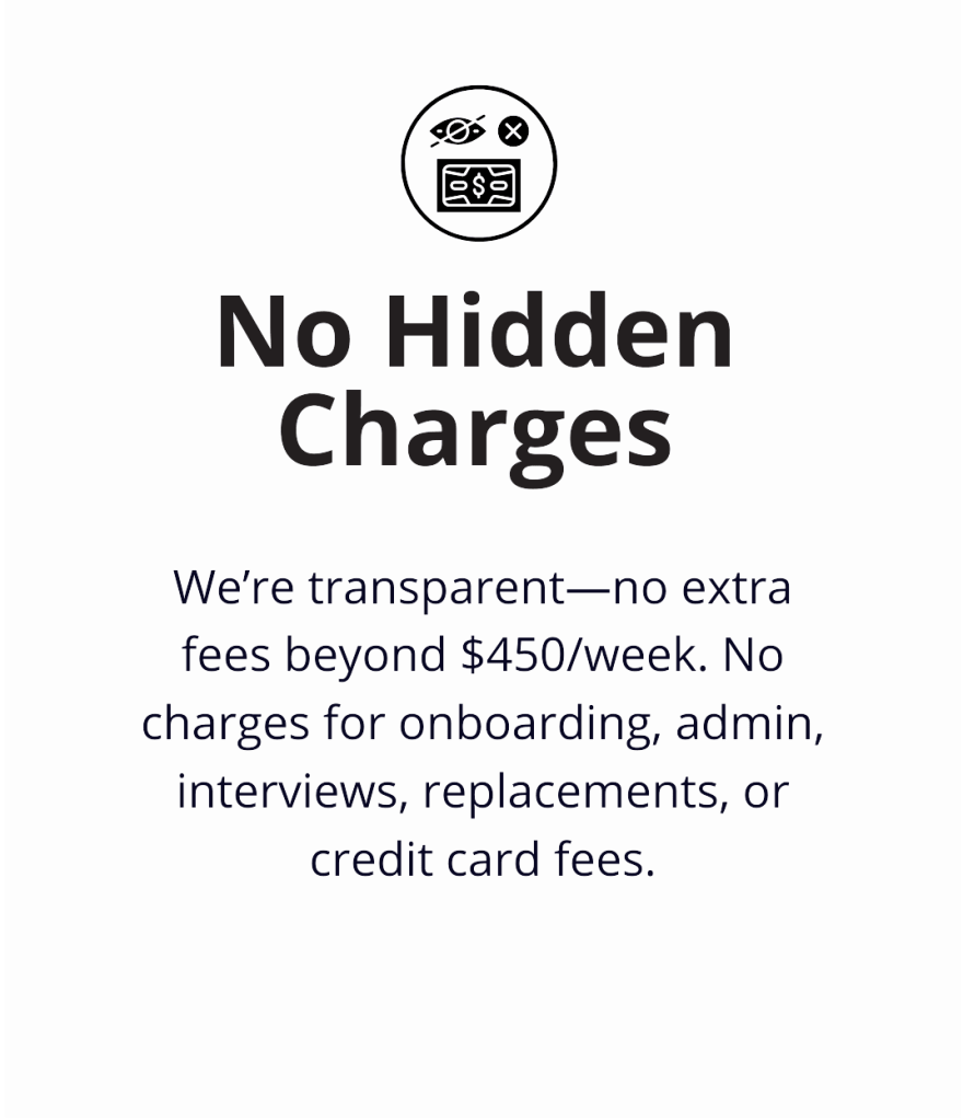 This will save you at least 50 hours you would have otherwise spent drafting a job description, advertising the role, shortlisting applicants, screening candidates, interviewing your shortlist, obtaining their references, negotiating terms of employment with them, signing them up, and ordering their equipment.