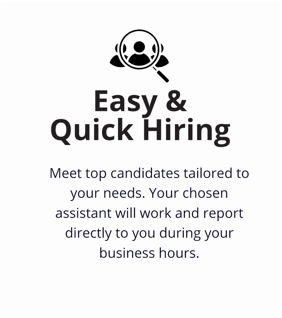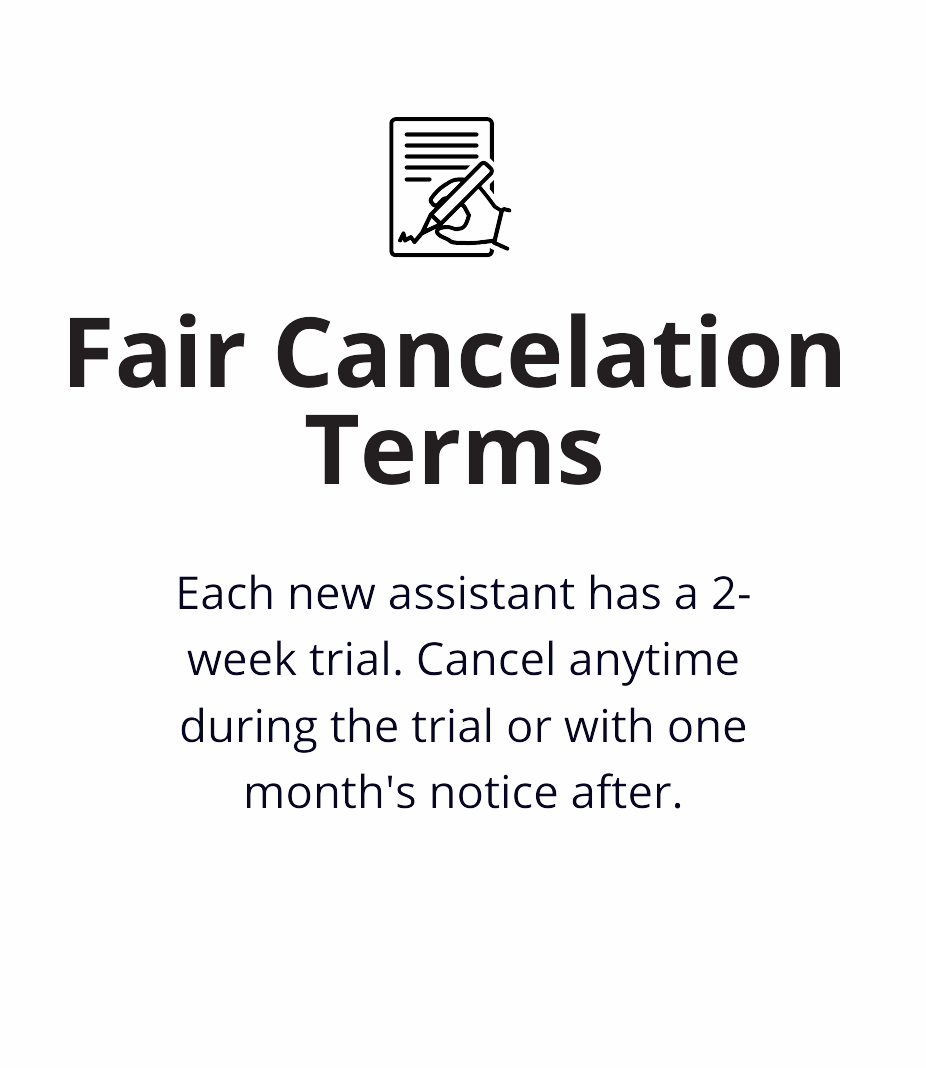 We believe that hiring staff shouldn’t be complicated or expensive, and if your needs change, you shouldn’t be stuck paying for a service you no longer need. Our terms offer you the flexibility and control you need so that you can hire a remote professional hassle-free and start focusing on growing your business: