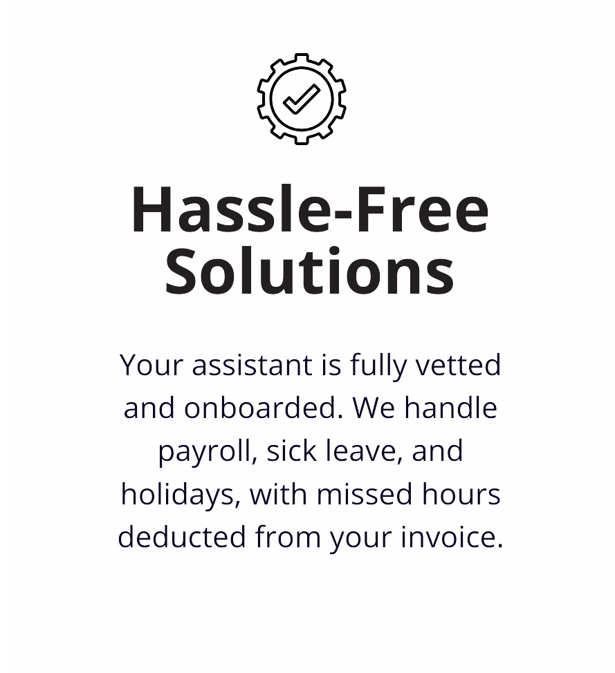 Our assistants are available to start immediately, and we manage their payroll, sickness, holidays, internet speed tests, and other time-consuming aspects.