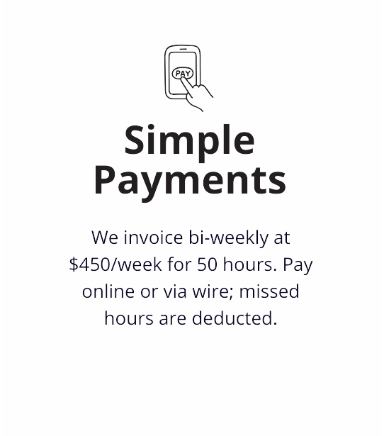 Our assistants work for 50 hours a week and cost only $450/week. This is only $9/hour and this covers everything. There are no other fees or charges.