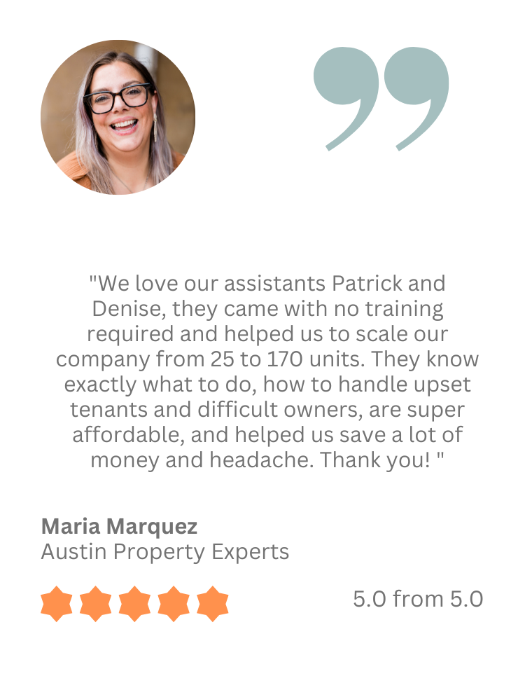 We are very passionate about supporting property management companies with their needs, and are the leading provider of remote property management assistants in the US. Our services have been tailor-designed for the specific needs of ambitious property management leaders who want to grow their business. Hiring with us is easy, cheap, hassle-free, and highly effective. Therefore we are proud to be voted the best property management remote staffing provider, and rated five stars by our clients.