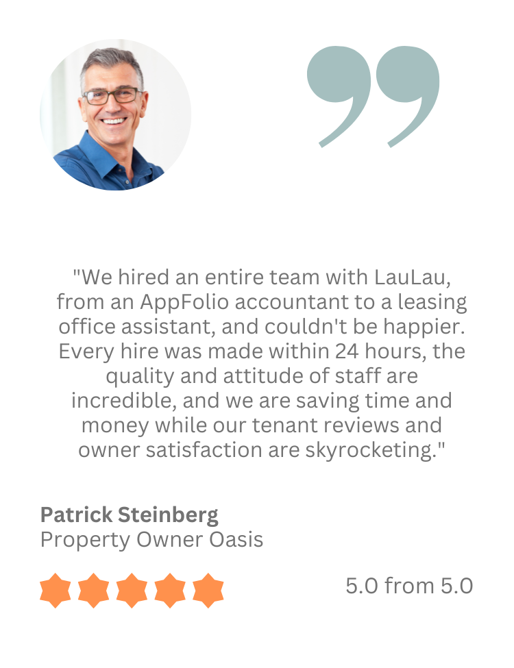 We have been working with property management companies since 2017, offering our clients fully trained, experienced AppFolio, PropertyWare, Tenant Turner, Buildium, and Property Meld assistants to support their marketing, leasing, maintenance, accounting, and operations processes. We have clients in 32 states and they range from family-run 20 unit AirBnB businesses to 1,700+ unit property management companies. By working with our remote assistants, they save 48-72% on payroll, have instant access to our pool of qualified candidates, and don’t need to worry about staff retention or employee benefits.